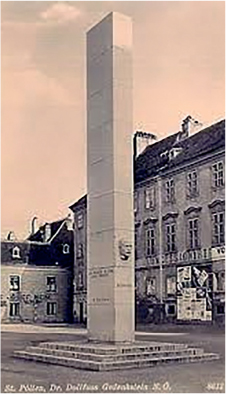 In den Städten wurden einige monumentale Dollfußdenkmäler auf zentralen Plätzen aufgestellt, etwa in St. Pölten und Graz. Das St. Pöltner Denkmal (Abbildung 36) bestand aus einem Stufensockel mit einer hohen, kantigen Stele mit Rechteckgrundriss, an deren Schmalseite eine vergleichsweise kleine Porträtdarstellung angebracht war, so dass der architektonische Denkmalcharakter dominierte. Das Denkmal wurde von Rudolf Wondracek entworfen und ebenso wie das Grazer Dollfußdenkmal bereits am 12. März 1938 abgerissen. Das Grazer Denkmal war ebenfalls eine hohe, schlanke Stele mit einer bekrönenden überlebensgroßen Porträtbüste von Gustinus Ambrosi.217