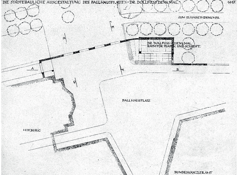 In der Folge wurden Denkmalidee und Projekt eines Dollfuß gewidmeten Infrastrukturbaus auf zwei Standorte aufgeteilt. Die „Dollfuß-Führerschule“ sollte nach einigem Hin und Her in stark reduzierter Form im Schönbrunner Fasangarten gebaut werden (siehe dazu Seite 70), das Denkmal war für den zentralen Ballhausplatz vorgesehen.