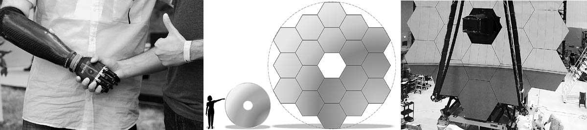 2. Основное зеркало телескопа «Хаббл» (слева) и состоящее из 18 сегментов основное зеркало телескопа «Джеймс Уэбб» (справа) в одном масштабе.