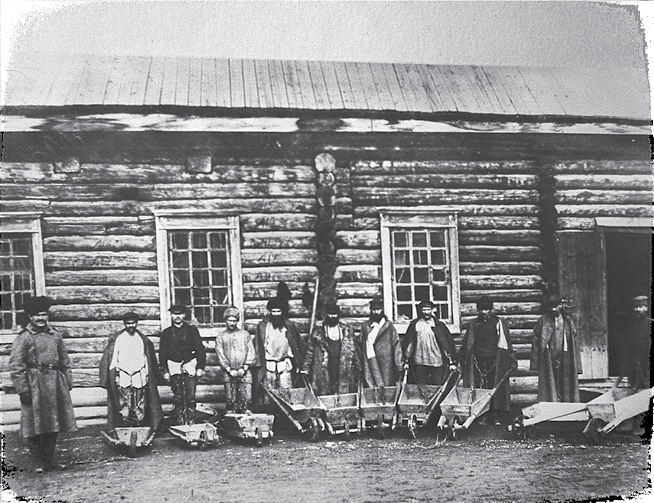 Оборванные, грязные каторжане, все имущество носящие с собой в заплечных котомках, каждый день совершали пеший путь от барака до участка, изрытого шахтами. Там под охраной нарядчика и четырех вооруженных солдат они били кирками породу, возили груженые тачки, крутили ворот промывочной машины.