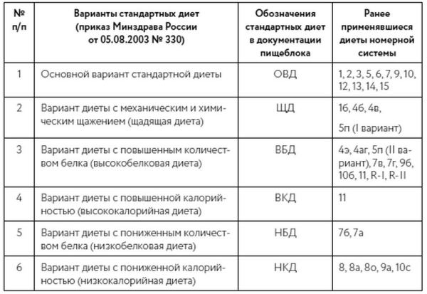 В августе 2003 года в целях оптимизации лечебного питания и совершенствования его организации приказом Минздрава России от 05.08.2003 № 330 «О мерах по совершенствованию лечебного питания в лечебно-профилактических учреждениях Российской Федерации» была введена новая номенклатура – система стандартных диет, различающихся по содержанию основных пищевых веществ и энергетической ценности, технологии приготовления пищи, среднесуточному набору продуктов.