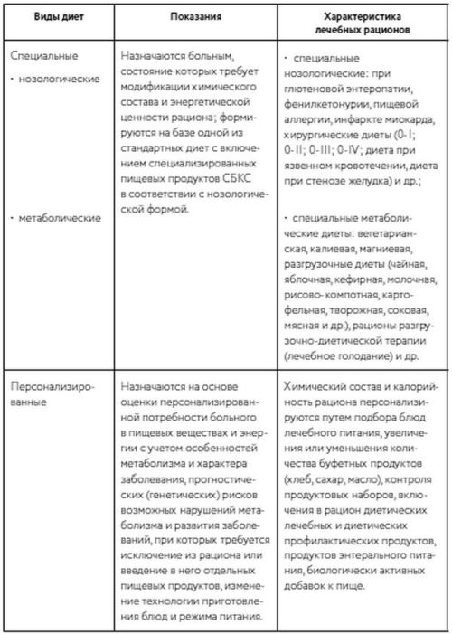 Таблица 3. Специальные и персонализированные лечебные рационы при проведении диетотерапии