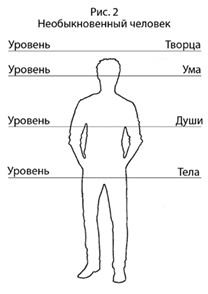 Здоровый человек может заболеть, компания, в которой он работает, может разориться, да и от измены нет страховки. Так что, когда «ломаются» основные три уровня, человек, дабы исправить ситуацию, должен начать творить. Творческий потенциал – это то, самое главное, что отличает человека от примата. Поэтому четвёртый уровень Творца мы и нарисуем над головой человека.