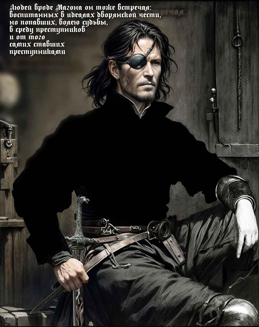 В проёме открытой двери показался третий незнакомец – высокий, худой человек с желчным цветом лица и редкими вороного цвета волосами, свисающими до плеч, одетый в черную вязаную куртку с высоким воротом, скрывающую от любопытных глаз тонкую кольчугу; черные узкие иберийские штаны, заправленные в высокие остроносые сапоги. Пересекающий его лицо шрам уходил под черную повязку, закрывавшую правый глаз.