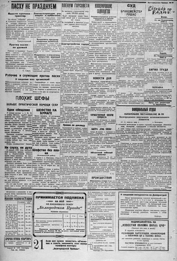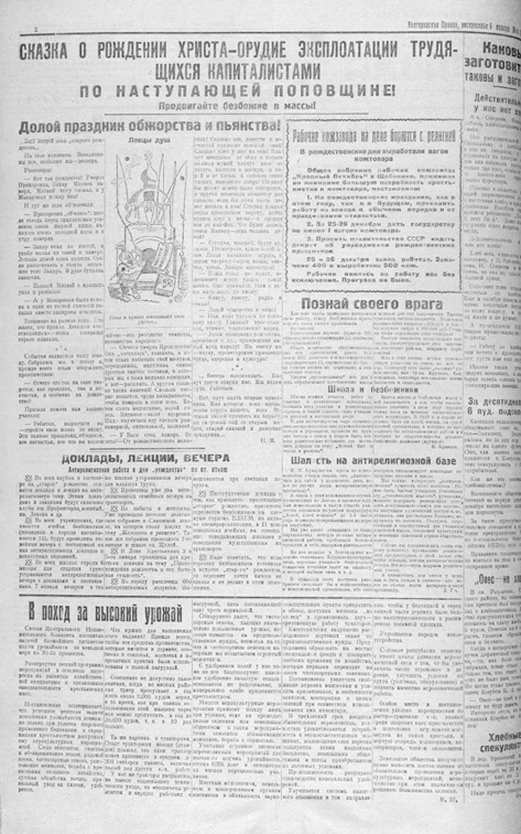 В рамках постановления ВЦИК от 8 апреля 1929 г. деятельность религиозных объединений «для удовлетворения религиозных потребностей верующих» была строго регламентирована. Не стоит забывать, что данный период, помимо борьбы с религиозностью, также характеризуется другими социальными потрясениями. Репрессии по отношению к духовенству, общая коллективизация и «раскулачивание», голод 1933 г., который «унес» великое множество жителей всего Курского региона. Помимо правового запрета на религиозную деятельность, исключения духовенства из социальной жизни, массового закрытия церквей, советская власть в начале 1920-х гг. проводила активную антирелигиозную политику в средствах массой информации на территории современных Курской и Белгородской областей. Газета «Трудовой день», выходившая в 1922–1925 гг. и под названием «Белгородской правды» в последующие годы, довольно регулярно и ярко освещала антирелигиозное направление власти путем публикации различного рода статей и заметок, посвященных задачам новой власти в рамках борьбы с религиозностью населения, агитации граждан в отношении отказа отмечать церковные праздники, упреков священнослужителей в обмане простого и «темного» люда. В газетных заметках публиковались различные «картинки из жизни» «попов» и сельских прихожан, которые должны были формировать негативное отношение как к священнослужителям, так и к религии в целом[67].