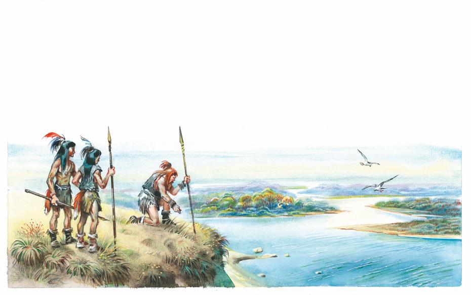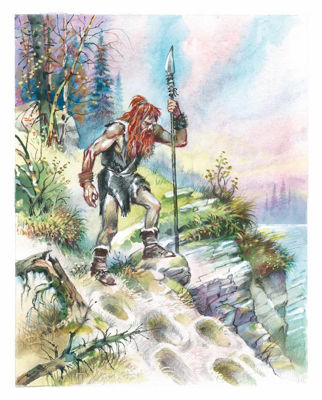 Когда он раздвинул гущу ветвей на краю берегового обрыва, можно было разглядеть его сутулую, коренастую фигуру. На нём было надето что-то вроде короткого мехового мешка, подпоясанного лыком. В прорезы высовывались жилистые руки, обмотанные широкими меховыми браслетами. Левая рука сжимала копьё с каменным наконечником. Человек втягивал носом воздух, подставляя под ветер широкие ноздри.