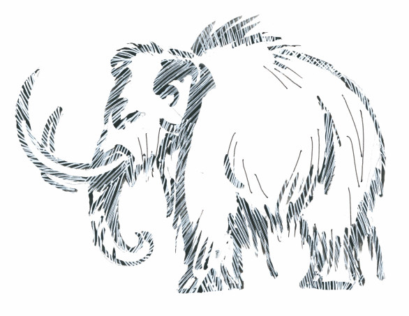 Ао подошёл к обрыву и уверенными взмахами копья начертил на гладком отвесе очертания зверя. Это был горбатый слон на толстых ногах. Он был покрыт прядями длинных волос и высоко поднимал концы могучих клыков. Фигура слона была сделана немногими скупыми линиями, но так искусно, что с первого взгляда можно было узнать, кого изображает рисунок.