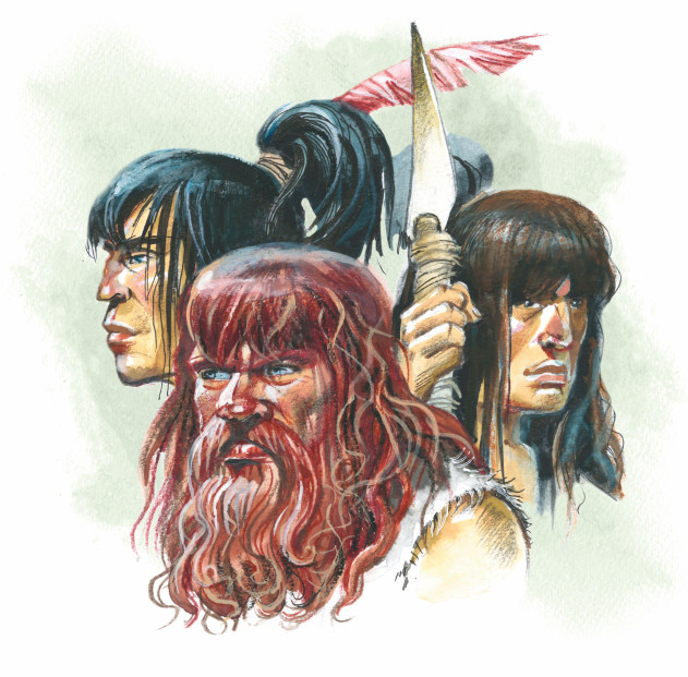 На их лицах не было ни усов, ни бороды. Прямые чёрные волосы, перевязанные на макушке, торчали пучком. В середину такого пучка было воткнуто перо, а у пояса назади болталось по лисьему хвосту. Горбатые тонкие носы, широко раскрытые глаза и соболиные брови придавали им смелый и воинственный вид.