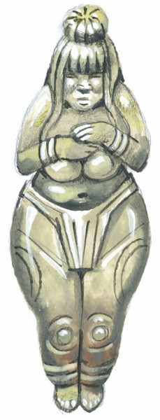 Третий охотник, Улла, стал искать что-то в глубине мешочка, сшитого из беличьих шкурок. Он вытащил оттуда белый предмет длиною в ладонь. Это была женская статуэтка, вырезанная из мамонтовой кости. Статуэтка была сделана очень искусно. Она изображала пожилую женщину с тонкими, прижатыми к груди руками. Голова её была опущена. На голове можно было различить что-то вроде шапочки, покрывающей причёску. Или, быть может, это были изображены завёрнутые венцом косы.
