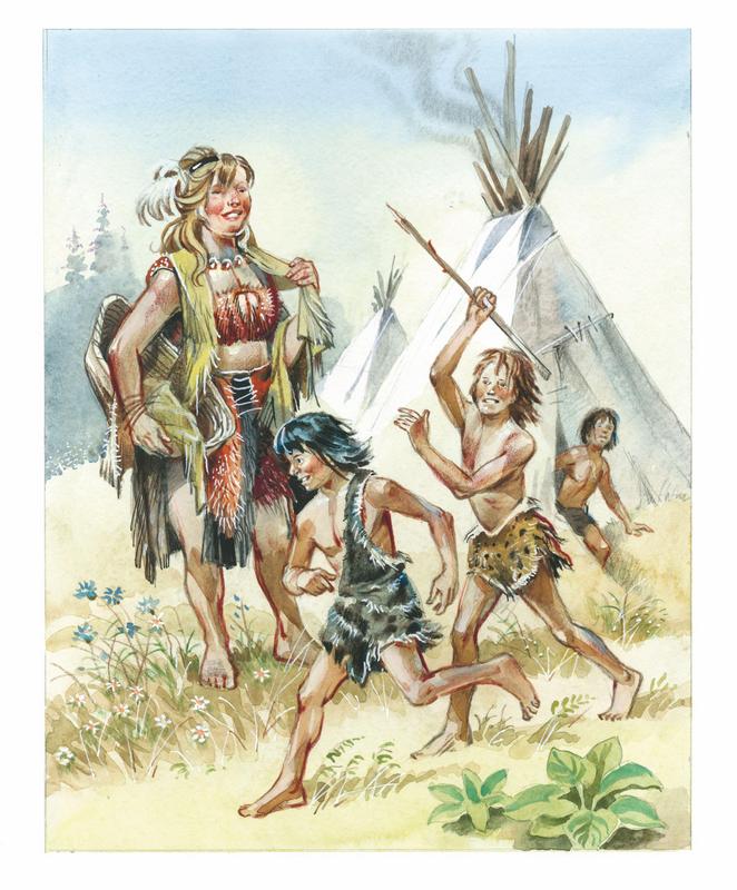 С десяток голосов откликнулось ему со всех концов. И скоро целая куча ребят, наскоро натянув на себя меховое платье, стала собираться на охоту. На поляне к ним присоединились дети из домов других матерей. Здесь детвора разделилась на две партии. Девочки-подростки отправились на опушку леса собирать съедобные травы, рыть корешки и искать в гнёздах птичьи яйца. Несколько мальчиков, завзятых любителей отыскивать яйца, отправились с ними. Другая ватага двинулась на берег реки. Это были самые старшие из подростков. Рыбная ловля требовала не только искусства, но и силы.