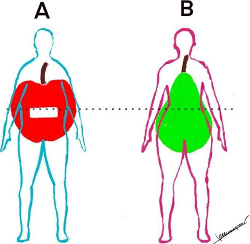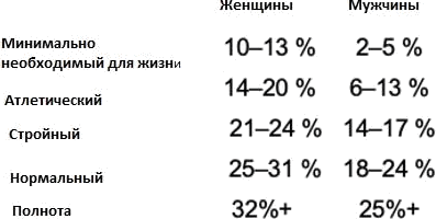 Таблица ниже, предоставленная Американским Советом по физической активности[32] показывает, как уровень жира зависит от пола и типа фигуры: