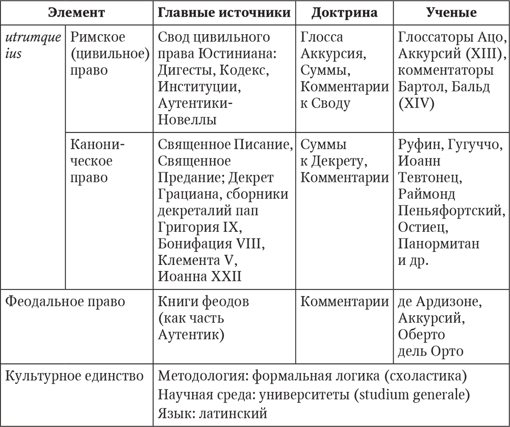 Таким образом, к концу XIII в. ius commune уже представляло собой универсальную правовую систему для всех народов христианского Запада, разработанную средневековыми учеными-юристами (глоссаторами, комментаторами, канонистами). Ее применение требовало специальной квалификации (профессиональной подготовки). Основными элементами этой системы были римское (цивильное) и каноническое право.