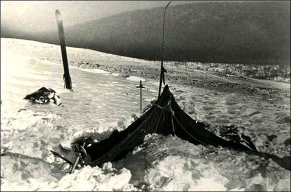 Как я отмечал в первой части, есть фотография палатки «дятловцев» после её обнаружения. Она многократно приводится в разных источниках и, поэтому, приведу два разных её варианта, но с одного кадра.