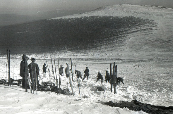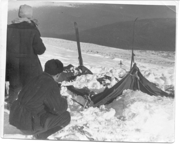 С печальным известием вернулись Слобцов и Шаравин. Пройдя по следу дятловцев несколько километров, они дальше пошли ихним азимутом вышли на перевал, разделяющий долины Ауспии и Лозьвы, где оставив уставшего проводника, пошли по склону высоты 1079 верх к привлекшей их внимание черной точке, которая оказалась порванной, полузасыпаной палаткой Дятлова…».