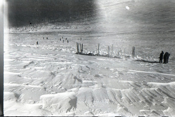 Это что-то длинное, торчит из снега под углом, на обоих снимках. Это не край палатки, присыпанный снегом. Это совершенно очевидно. Во-первых, от этого предмета отходит полосовидная тень, значит, он не лежит, а именно торчит. Во-вторых, этот предмет пересекает несколько комьев снега, и если бы это был край палатки и находился под снегом, под этими комьями, то был бы прижат и принял форму этих комьев. Да и не может край палатки, засыпанной снегом так ровненько торчать из-под снега. Что это?