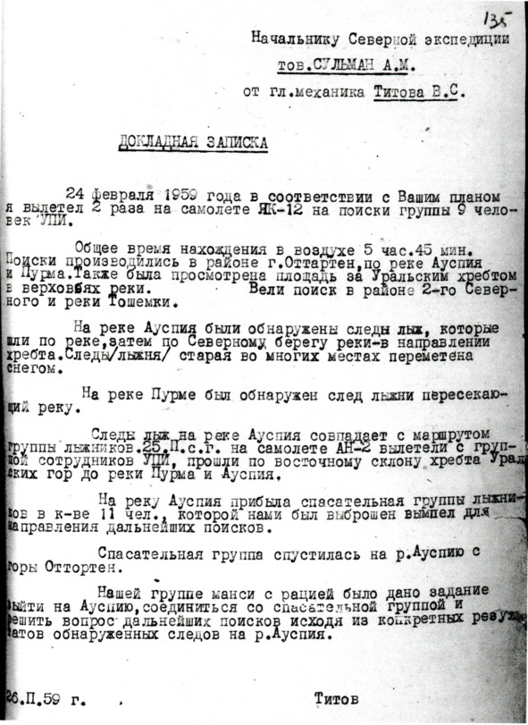 В материалах дела эту тему имеется только один официальный документ, составленный непосредственным участником поиска с воздуха – «Докладная записка гл. механика Титова В. С.». Привожу её полностью: