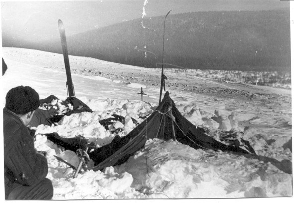 К тому же, для установки палатки была вырыты яма, левый край которой был вровень с палаткой. А то и выше. Помните – глубина снега 1,5 метра? Втыкать туда лыжу на всю длину просто бессмысленно, ни к чему. Всё просто. Крыша палатки посредине поддерживается центральной подпоркой, и растягивается при помощи лыжных палок по краям. Лыжа для растяжки уже не нужна.