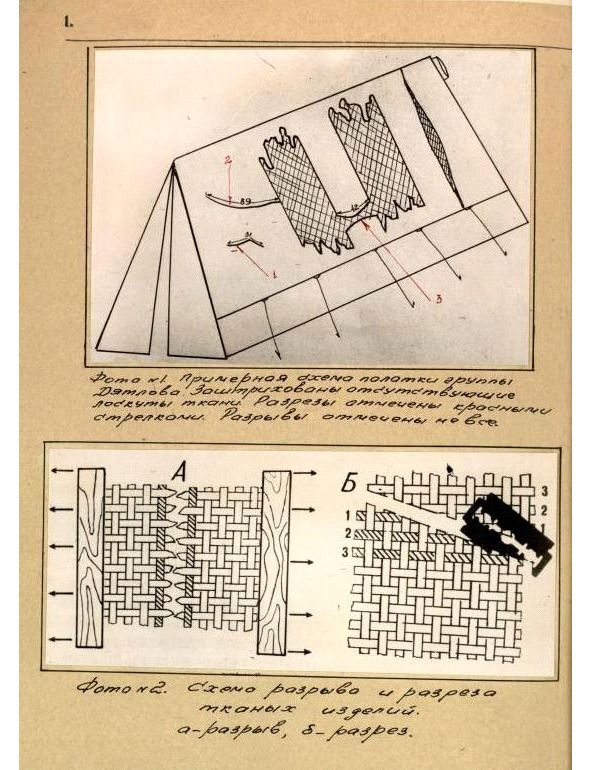 Да и не сразу решились резать и рвать палатку, всё-таки – зима, холодно и ветер. Об этом вполне свидетельствуют царапины изнутри палатки по краям («с внутренней стороны палатки в участках близлежащих к краям разрезов имеются поверхностные повреждения ткани в виде незначительных проколов, надрезов нитей ткани и очень тонких царапин»). Видимо было сделано несколько слабых нерешительных попыток. Но ситуация, вероятно, быстро стала такой, что медлить было уже нельзя, палатку надо покидать срочно. И тогда всё решилось очень быстро.
