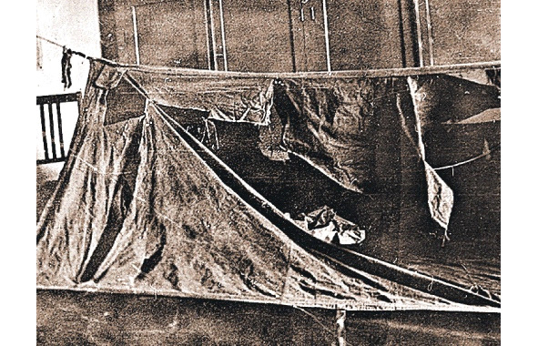 Эти фотографии делались при исследовании палатки в ленинской комнате в Ивдельском УВД. Там палатку растянули на верёвках и стульях.