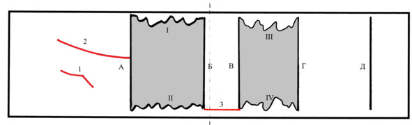 Оставлю обозначения разрезов как в экспертизе от одного до трёх. Разрывы обозначены буквами от А до Д. При этом точность расположения разрывов Б-Д, я думаю, получилась достаточно высокая, разброс плюс-минус по пять сантиметров в обе стороны от обозначенного. Более сложно с разрывом А, его точность расположения около 10 см в обе стороны. Но добавлю ещё четыре обозначения, для разнообразия, римскими цифрами: I, II, III и IV – так для точности обозначу верхние и нижние края отсутствующих фрагментов.