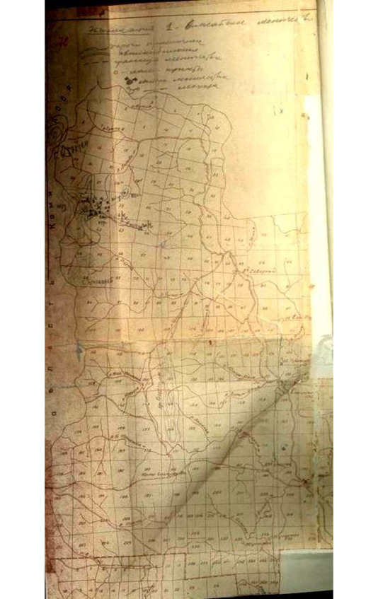 «1 – Вижайское лесничество»; сама цифра «1» стоит в центре карты в круге. Ниже надпись: «дороги просёлочные» и ещё ниже «автомобильные» с соответствующими обозначениями. Под ними пунктирная линия с обозначением: «граница лесничества». В нижней части карты можно отчётливо проследить данную линию.