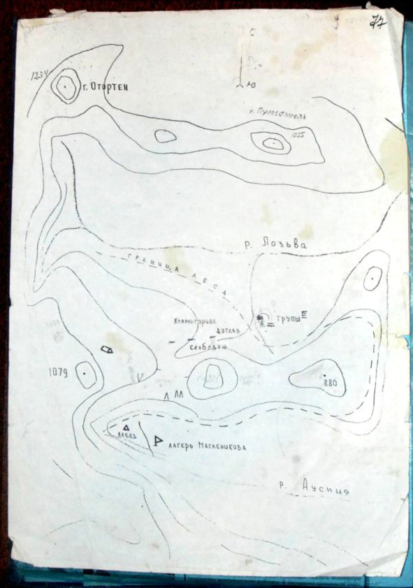 При рассмотрении фрагмента в правом нижнем углу видна надпись «2-й Северный». По левому краю карты надпись «Коми АССР», рядом – «Отортен». Ниже как раз располагается место действия, крестиком обозначен перевал Дятлова, и, скорее всего, место расположения палатки. Там же обозначена река Лозьва. Впрочем, масштаб мелкий, а надписи почти неразличимы.