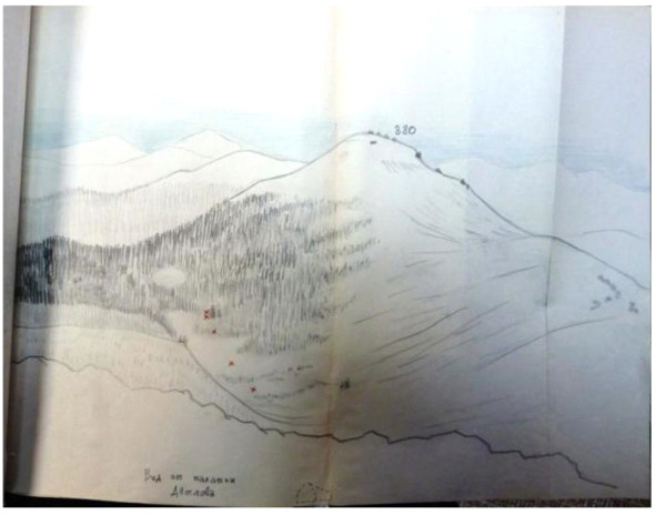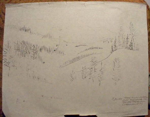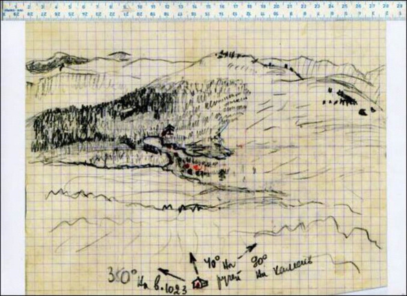 Рис. №29. Рисунок, который вполне отчётливо даёт наглядное представление о месте действия. Надпись: «Вид из палатки Дятлова».