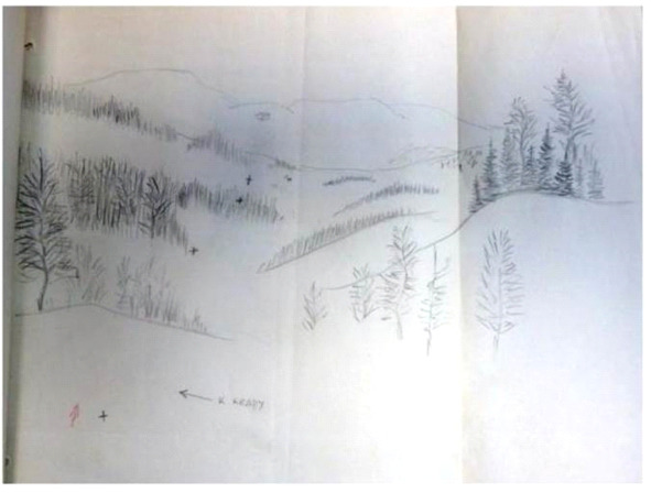 Вид от места расположения палатки. Кедр и тела отмечены, видна граница леса. Но вот что интересно, отчётливо видно, что в этом месте лес отступает, а безлесная зона в виде неровного языка вдаётся вглубь леса. А кедр стоит по краю данного участка, и совсем незначительно углублён в лес. Впрочем, лес по краю – условный, мелкий, редколесье, и это на рисунке хорошо изображено. Также отмечена высота 880 и каменные гряды. По нижнему краю кадра условно отмечено расположение палатки. Крестиками обозначено расположение трупов, соответственно, от леса к палатке: Дятлов, Слободин и Колмогорова и у самого кедра трупы Кривонищенко и Дорошенко. Также и на других схемах.