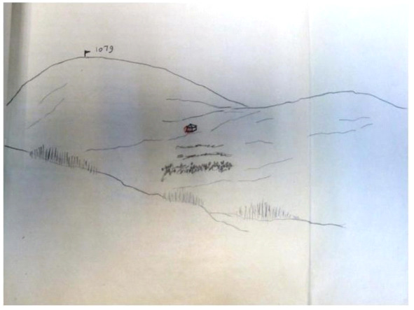 Рис. №33. Ещё один рисунок, кажется, что по сравнению с другими малоинформативный. Но, на нём обозначены три каменные гряды и расположение палатки.
