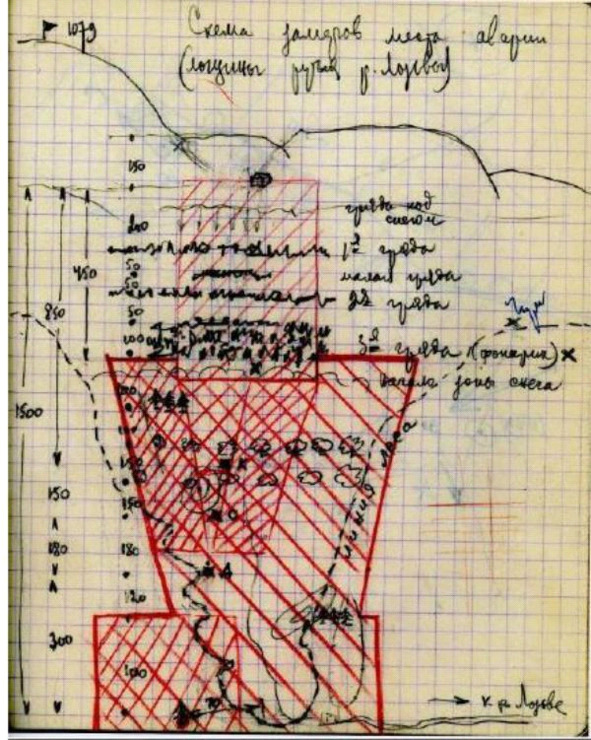 Я этой схемой уже пользовался немного раньше. Здесь вполне конкретно обозначены высоты «1079» и «880», расположение палатки, граница леса, кедр и расположение трупов, а также привязка к сторонам света. Хотя, мне кажется, с обозначением сторон света есть незначительная ошибка.