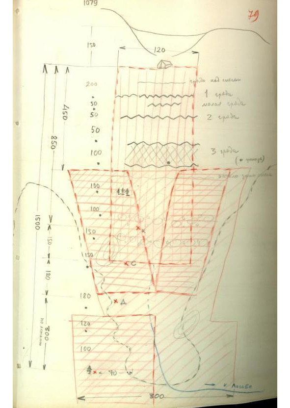 Здесь более отчётливо видно расположение фонаря, который был обнаружен на склоне. Фонарь обнаружили на третьей каменной гряде. Вот что сообщает об этом Атаманки Г. В. (лист 220): «Последующие два дня (7—8 марта) были посвящены заканчиванию работ в районе ручья, одновременно группа в пять человек, оснащённая лавинными зондами, прошла овраг в 50 м за кедром, обследовав участок протяжённостью в 300 м. Никаких результатов это не дало, кроме того, что в метрах 100 ниже палатки был найден электрический фонарик во включенном положении с выгоревшей батарейкой…».