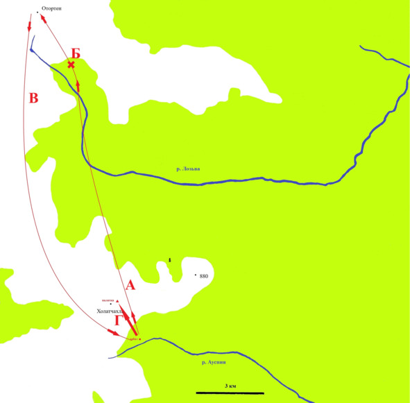 Эта схема мне нужна, чтобы окончательно разобраться с замыслом Дятлова, почему они остановились на перевале именно в этой точке. Я уверен это не случайно, а совершенно целенаправленно и обдумано. По изначальному плану похода планировался радиальный выход к Отортену в три дня. После устройства лабаза предполагалось следовать по лесу, возможно придерживаясь русла Лозьвы (маршрут обозначен буквой «А») и на выходе из леса устроить ночёвку (место приблизительно обозначено буквой «Б»). На второй день восхождение на Отортен и ночёвка. На третий день возвращение по горам к лабазу (путь «В»).