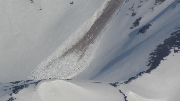 Рис. №3. В качестве иллюстрации нашёл вот такую фотографию. В нижней части снимка виден край отрыва «снежной доски», который произошёл несколько ранее, а сверху идёт снежнопылевая, относительно небольшая, лавина. Да и крутизна склона на вид небольшая, около 15 градусов или немного больше. А на заднем плане явные следы схода более ранних лавин.