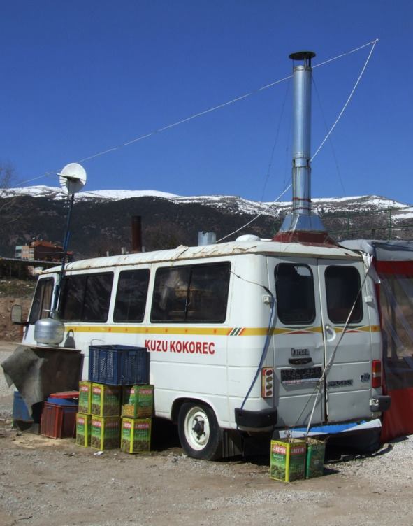 Поселок Серинхисар находится уже по ту сторону горной цепи, окружающей амфитеатром наш Денизли. Плотно укрытые снежными шапками вершины эффектно смотрятся на фоне ультрамаринового неба. Но наш взор приковывают не горы, а придорожная кафешка, оборудованная внутри микроавтобуса: закопченная труба очага выведена наружу через крышу, колеса подперты жестяными канистрами из-под оливок, к входной двери примыкает алая палатка с пластиковыми столиками внутри. Такой примитивный сервис вызывает не аппетит, а лишь вопросы: куда смотрит санэпидемстанция и Евросоюз, в который всеми силами стремится Турция.
