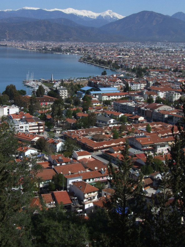 Видимо, Сейран наметил какой-то план, которым с нами не делится, поэтому ведет машину, не останавливаясь и не рассказывая, мимо чего проезжаем. Нам же все необычно, хочется все осмотреть и везде сфотографироваться. Так что с каждым километром пути наши лица становятся все недовольнее. Начинаем бурчать. Поэтому нашему приятелю волей-неволей приходится сделать остановку возле гробниц царей Ликии ― античной страны, располагавшейся на юге Малой Азии. Впрочем к самим древностям не подходим, успевая лишь щелкнуть панораму Фетхие. Отсюда город как на ладони, растекся пестрым покрывалом по всей долине, защищенной заснеженными горами.