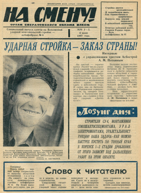 Шестая обогатительная фабрика должна была стать крупнейшей в мире, поэтому газеты тут же назвали её Асбогигантом. Стройку объявили ударной комсомольской, и обком ВЛКСМ поручил нашей редакции организовать на базе городской типографии в Асбесте издание специального выпуска газеты «На смену!».