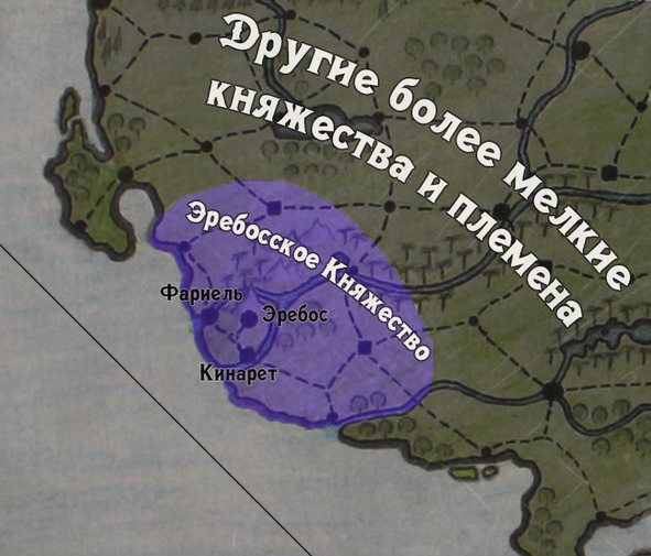 Его наследник Эйрис I, занявший трон после отца в 2546 году, был великодушен, дружелюбен и щедр, любим как знатью, так и простым людом. Князь Эйрис не любил раздоры, а особенно войны. Но всё же, за более 30 лет правления он захватил несколько агрессивных городов-государств вокруг своих границ для обеспечения защиты Эребосского княжества, в прочем, большинство из этих княжеств сами были виновниками войны.