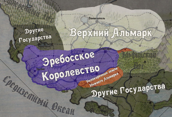 Первенца Эйриса назвали Деймон. Он не был похож на своих предков, Деймон мечтал захватить все окрестные земли вокруг княжества и был уверен в том, что ему суждено создать великую империю. Взойдя на трон в 2577 г. от ИТ, он сразу начал войну с мирными беззащитными соседскими княжествами. Увеличив границы, он объявил себя королем, а свое государство – Эребосским Королевством. Первым серьёзным противником оказалось королевство Нижний Альмарк, со столицей Скайгард. Некогда сильное королевство Альмарк распалось на Нижний и Верхний Альмарк, вследствие расхождение во взглядах и междоусобицы, ещё в прошлом веке. Нижний Альмарк был мирным, но большим государством, и у него было множество союзников. Теряя поселение за поселением, он долго сопротивлялся покорению короля Деймона, но вскоре сдался под натиском противника. Правитель Нижнего Альмарка пал в бою, защищая Скайгард в 2584 г. После этих событий Деймон получил прозвище Завоеватель.