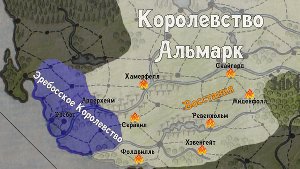 Произведя очередную мобилизацию и добившись хотя бы незначительной помощи от союзнических княжеств, Дезмонд собрал достаточное количество войск для похода. Но и королева Кассандра не теряла времени, она уже продвинула свои войска вглубь Нижнего Альмарка в сторону Скайгарда. Несколько городов уже были освобождены и множество восставших вступали в ряды эребосского войска. В это время, в Скайгарде всё ещё бушевали восстания, город практически разделился на два лагеря: ополченцев и верхне-альмаркских оккупантов.