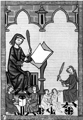 Рис. 1–3. На лекции в Реймской школе (из средневековой рукописи).