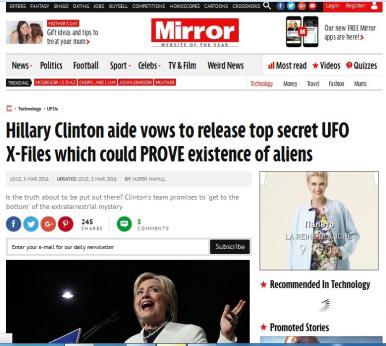 Затем в марте 2016 года Джон Подеста, руководитель избирательного штаба Хиллари Клинтон, вдруг заявил, дескать, когда мадам станет президентом – раскроет секрет НЛО.[57] А британский журнал «The Economist» удивил публику обложкой года 2016, где красовалось «тарелка» с банальным человечком внутри. Журнал конспирологи считают рупором семейства Ротшильдов, соответственно, обложка года рассматривается как программа грядущих событий. Так что тарелочка, внутри которой клерк с портфелем, это как бы предсказание о расшифровке НЛО с альтернативой инопланетянам. Правда, ротшильды просчитались: в центре обложки красовалась физиономия Хиллари, а вместо неё президентом США стал Дональд Трамп. Соответственно, и «люди в черном» остались в тени.