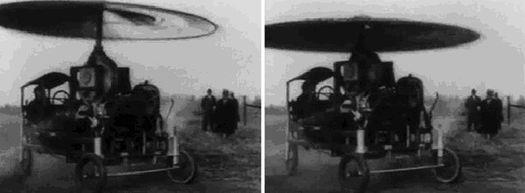 Часто по ТВ показывают кадры кинохроники из истории авиации, где среди допотопных планеров и «этажерок» фигурирует странное устройство – вроде огромного зонта с мотором и пилотом.[66] «Зонт» дергается вверх-вниз, как бы старается зацепиться за воздух. При его движении вниз аппарат даже отделяется от земли на миг. Что же это за аппарат, и какое он имеет отношение к летающим тарелкам?