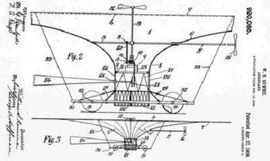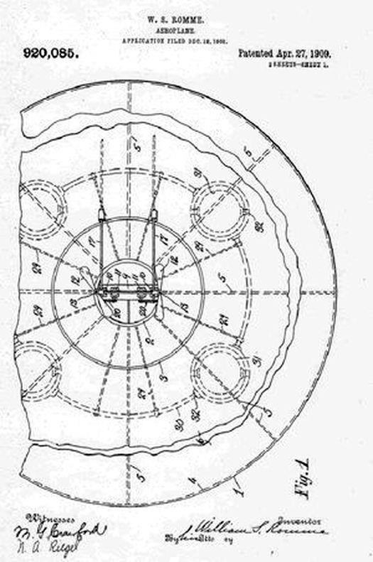 Начнём с того, что первый патент на «летающую тарелку» в США был выдан в 1909 году. Это огромный диск, переходящий по центру в полый конус с раструбом, повернутым вниз, в раструбе – два винта (должны направлять к земле струю воздуха) и ещё один винт тянущий. Этот aeroplane запатентовал изобретатель Уильям Ромм (W.S. Romme). Аппарат вроде бы не был построен, но схема дисковидного крыла позднее позволила Ромму изобрести другую летающую машину, запатентованную в 1912 году. Такой самолёт-зонтик был реально создан: работы финансировал зять Джона Рокфеллера – Харольд Маккормик (Harold F. McCormick).[67]