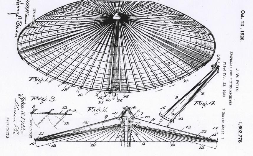 Патент на это новое летательное устройство – ортоптер – получил в 1926 году изобретатель Джеймс Питтс (J.W. Pitts). По мысли изобретателя, зонтик должен бить по воздуху в ходе вертикальных движений вниз, а в ходе вертикальных движений вверх узкие лопасти вращающегося зонтика приоткрывались, чтобы снизить силу лобового сопротивления. Но, как видим, взлететь этот самолётозонтик-2 так и не сумел (именно он представлен на кадрах вышеупомянутой кинохроники).