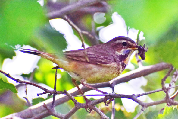 Тем не менее с подружкой главного соловья моего сада я встретился в первый же год знакомства с певчими. Лето постепенно набирало скорость, расслабленное майское бытие уже не вспоминалось, у дачников начались заготовки садовых даров на зиму, а у варакушек птенцы вылетели из гнезда на вольные хлеба. Моя кустарниковая скромняшка благополучно жила в саду и никуда не собиралась пропадать. Варакушки, как правило, привязываются к одному месту, всё лето проводят неподалёку от своего заведённого гнезда.