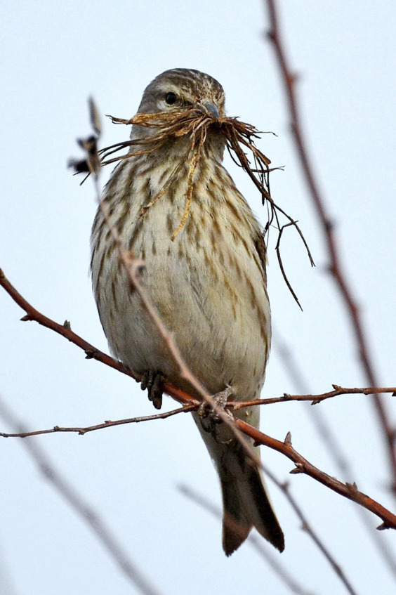 Вынув из кустов отслужившее гнездо коноплянок и попробовав разделить его надвое, я удивился, как крепко оно сплетено. Казалось бы, обычные травянистые стебли должны были легко расползтись, но не тут-то было, пришлось приложить значительное усилие. Плетение выполнено с подвохом: стебли скреплены паутиной (я-то ничего не разглядел, так утверждают специалисты), но мне кажется, должны быть какие-то скрытые узелки, которые при растяжении затягиваются, очень уж плотная получилась вязка, да и попробуйте найти паутину в апреле, когда закладываются первые в сезоне гнёзда. Снаружи травины грубые, внутри – тонкие, лоток выстлан мягкими материалами. Сложное, с инженерной точки зрения интересное сооружение.