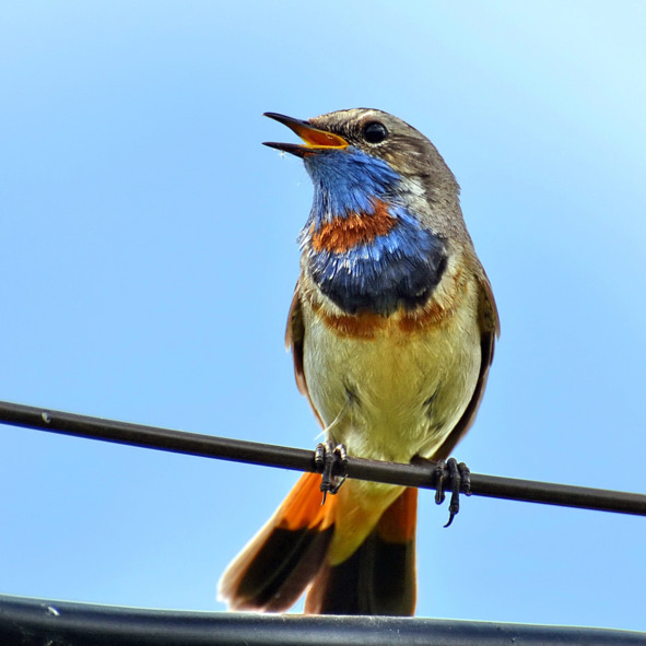 Его не было, но через некоторое время вижу – летит прямо на меня, свистит что есть духу и вдруг надо мной резко затормозил в воздухе, завис, часто маша крылышками, подобно голубю турману перед началом многокаскадных переворотов, так что я даже заволновался: вдруг и вправду начнёт кувыркаться, а высота-то – всего метра четыре. Артист благополучно закончил акробатическую составляющую номера, сел на излюбленное место на тросе «лицом» ко мне и продолжил закладывать свою потрясающую арию уже в статичном положении. От возбуждения варакушка даже распушил хвост, засверкавший в солнечных лучах неотразимым оранжевым шлейфом. Это было тем более удивительно, что варакушки должны закругляться с концертами, время песен заканчивалось. Мой опыт наблюдения за птицами толком даже не начал накапливаться, и я было подумал: весь этот утренний концерт разыгрывается для меня, малышка соскучился и приветствует моё возвращение! Почти уверился в этом совершенно невероятном предположении и начал подсвистывать своему любимцу, включая время от времени в пересвист небольшие весёлые отрывки из популярных мелодий.