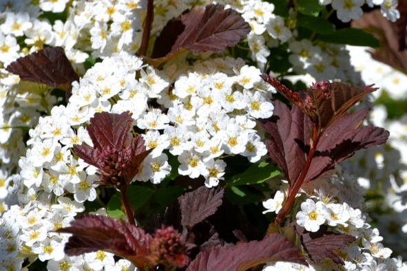 Покаюсь: загустил я посадки, это часто случается с неопытными озеленителями. Но оказалось, что нечаянно получившиеся композиции растений сочетаются изумительно. Ослепляющие своей белизной пониклые цветковые ручейки спиреи Вангутта, словно специально перед камерой, расступились и пропустили навстречу солнцу и восхищению зрителей зацветающие побеги краснолистного пузыреплодника.
