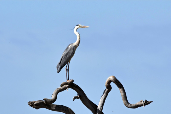 Здесь же, неподалёку от обрыва, выехав на речной берег, увидел я стоящую на мелководье серую цаплю. Цапля обычно охотится на лягушек и рыбу, стремительно схватывая их клювом. Чтобы не вспугнуть птицу, остановился и, надо сказать, удачно: около неглубокого овражка, сбегавшего к реке. Осторожно соскользнул на его дно, подобрался почти вплотную к длинноногой красавице, но стоило мне выглянуть из укрытия, птица переполошилась и улетела. Не сообразил хотя бы пучком травы замаскировать свою любопытную физиономию. Подосадовал, да ничего уже не исправить. Но цапля будто пожалела меня, отлетела недалеко, на высушенные, причудливо перевитые корни вывернутого вешней водой дерева, подарила фото со щёгольской тёмно-серой косичкой. В средние века цапля ценилась как объект соколиной охоты. К счастью для птицы, сейчас это всего лишь забытый пережиток далёкого феодализма.