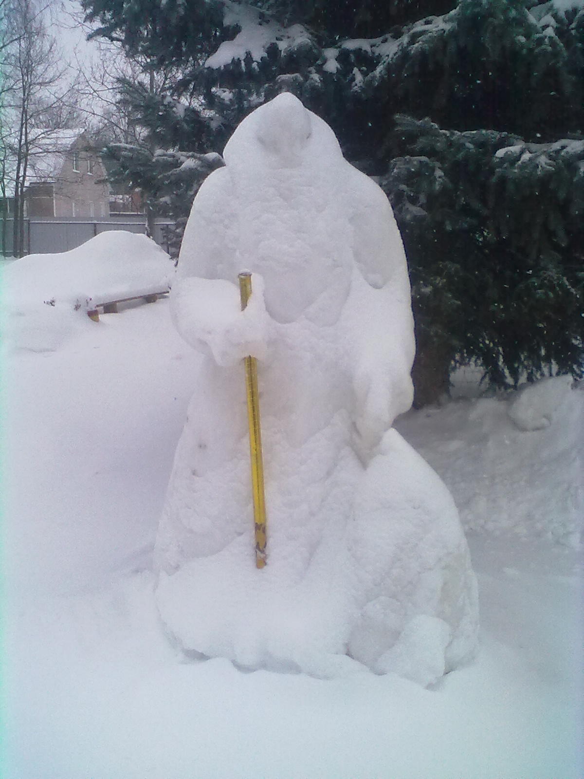 У входа голубая ёлка, как у всякого уважающего себя административного здания, и прямо некрасовский Мороз-воевода ну просто скульпторской лепки, сутулый, но всё равно грозный, в шлеме, с густой бородой, и с посохом. Его вылепили из снега и закрепили водой.